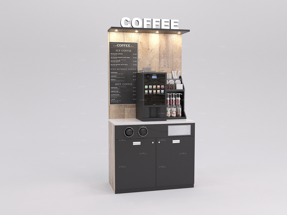 Меню и кофейная зона дополнительно освещаются врезными светильниками, установленными на козырьке корнера.