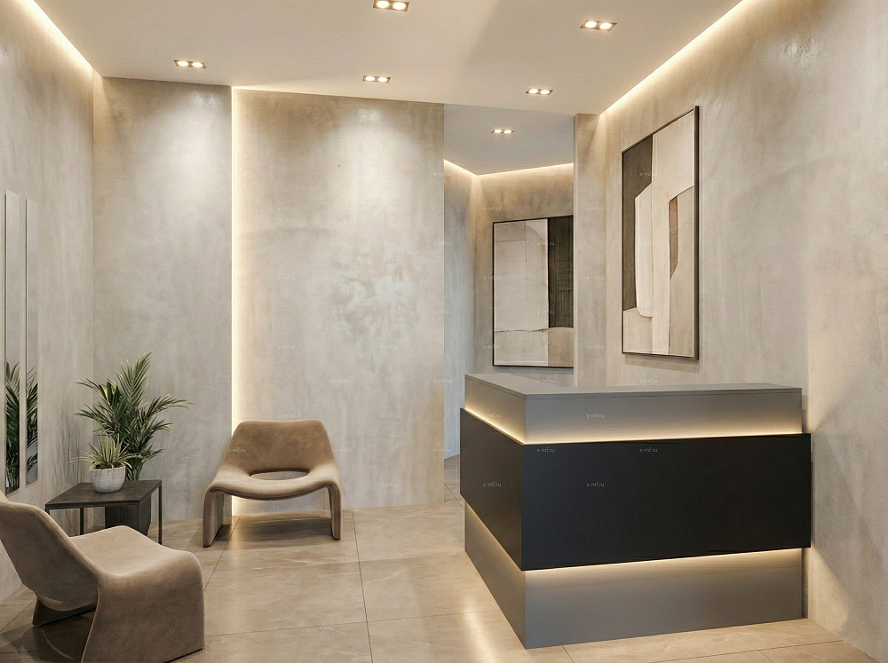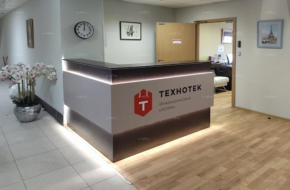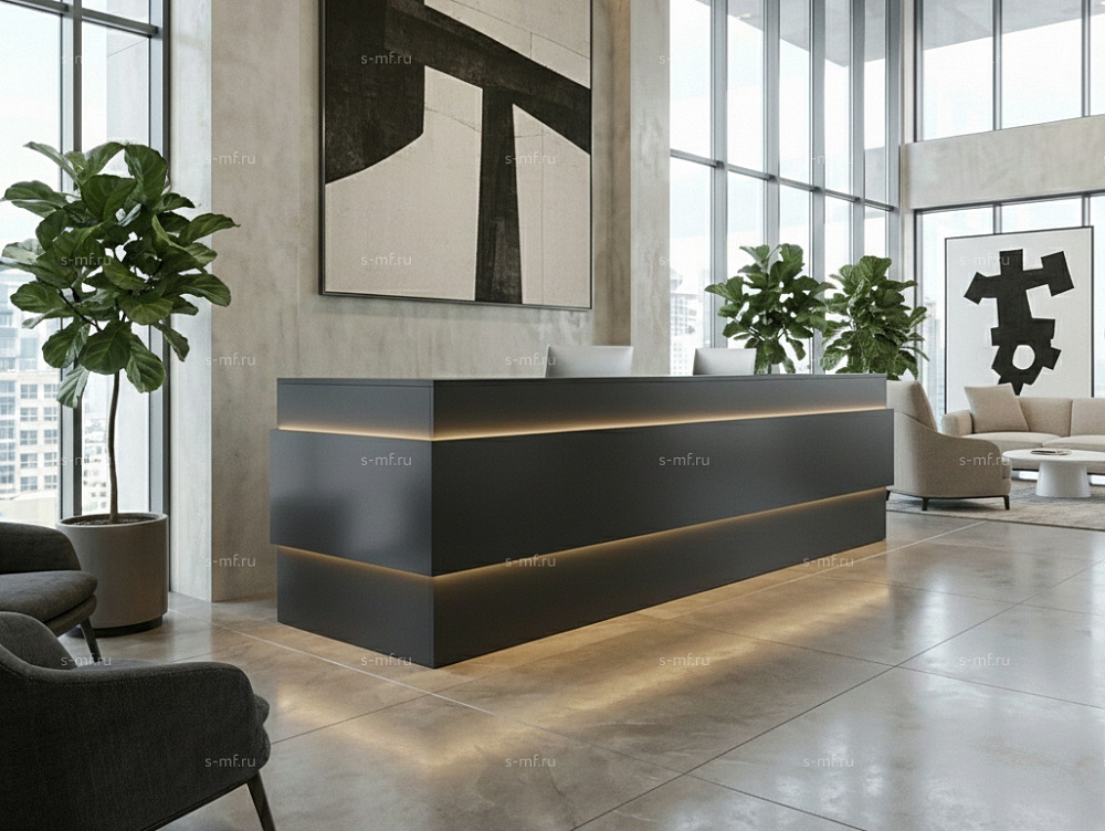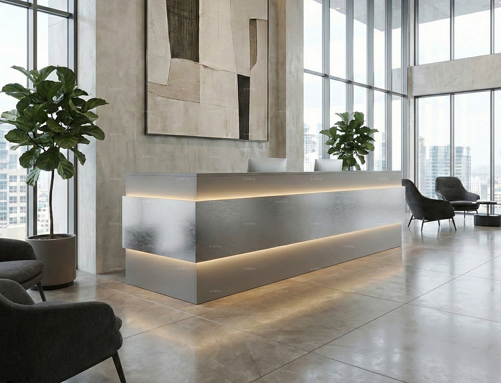 Фасад стойки ресепшн декорируется накладками с подсветкой.