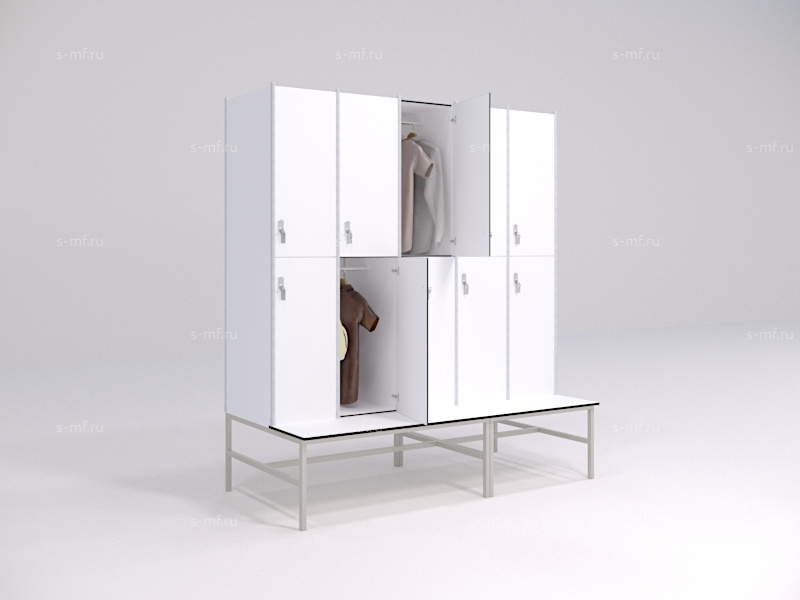 Двухсекционные шкафчики помогут сэкономить пространство в зоне раздевалки и обеспечить наибольшую вместимость мест на небольшой площади. Посетители смогут удобно расположиться на скамье, интегрированной со шкафчиком.