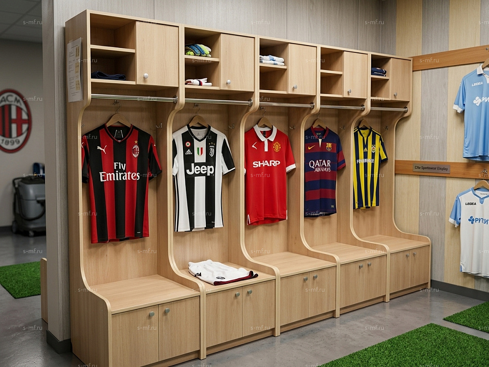Шкафчики для футболистов. В данных шкафчиках используется высококлассное ЛДСП Ламарти. Покрытие у него толще, чем у обычного ЛДСП. Плотность выше, чем у всех ЛДСП. За счёт этих характеристик шкафчики будут меньше подвержены влаге и механическим повреждениям. А фурнитура будет надёжно прикручена. Так же это ЛДСП самое безопасное и подходит для использования во всех сферах, в т.ч. в детских учреждениях.