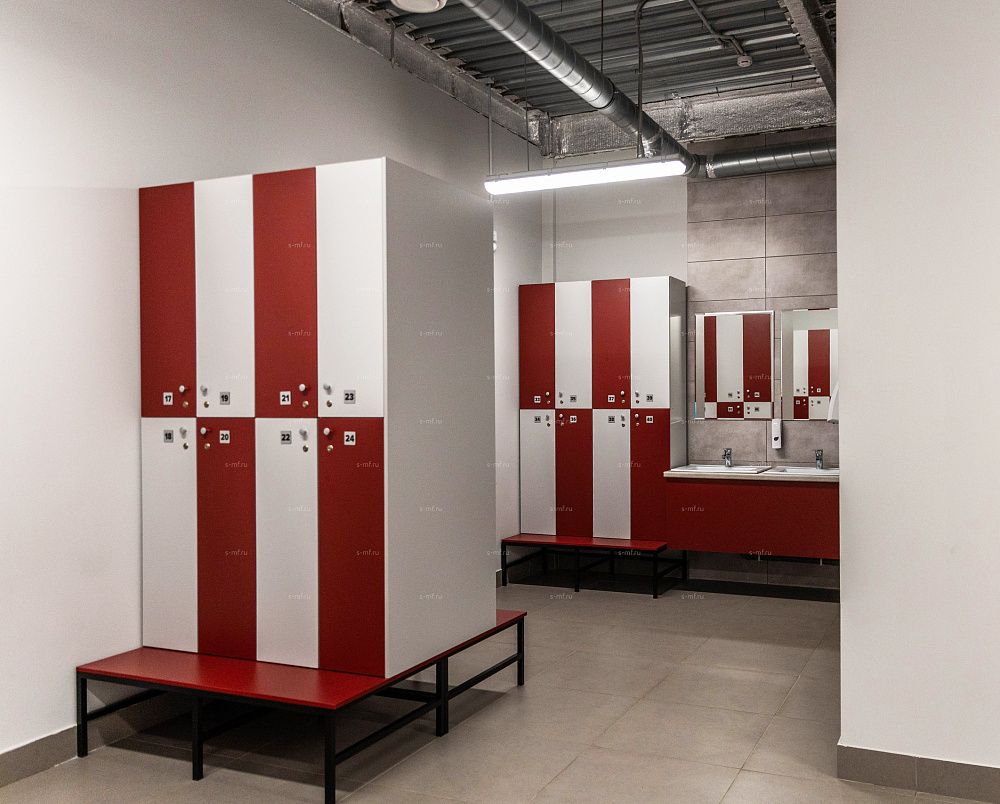 Двухсекционные шкафчики помогут сэкономить пространство в зоне раздевалки и обеспечить наибольшую вместимость мест на небольшой площади. Удобная опция - скамья с подставкой.