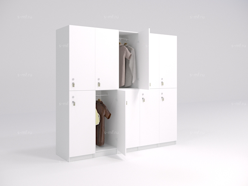 Двухсекционные шкафчики помогут сэкономить пространство в зоне раздевалки и обеспечить наибольшую вместимость мест на небольшой площади. Удобная опция - скамья с подставкой.