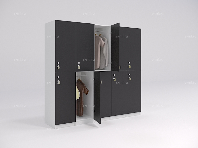 Двухсекционные шкафчики помогут сэкономить пространство в зоне раздевалки и обеспечить наибольшую вместимость мест на небольшой площади. Удобная опция - скамья с подставкой.