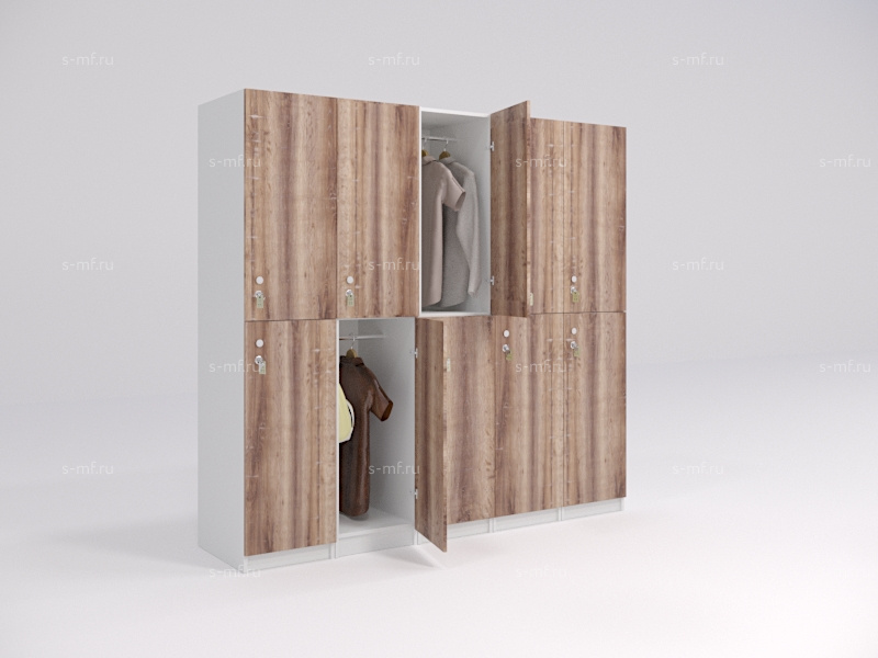 Двухсекционные шкафчики помогут сэкономить пространство в зоне раздевалки и обеспечить наибольшую вместимость мест на небольшой площади. Удобная опция - скамья с подставкой.