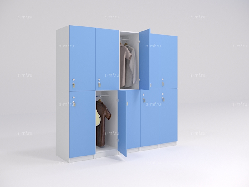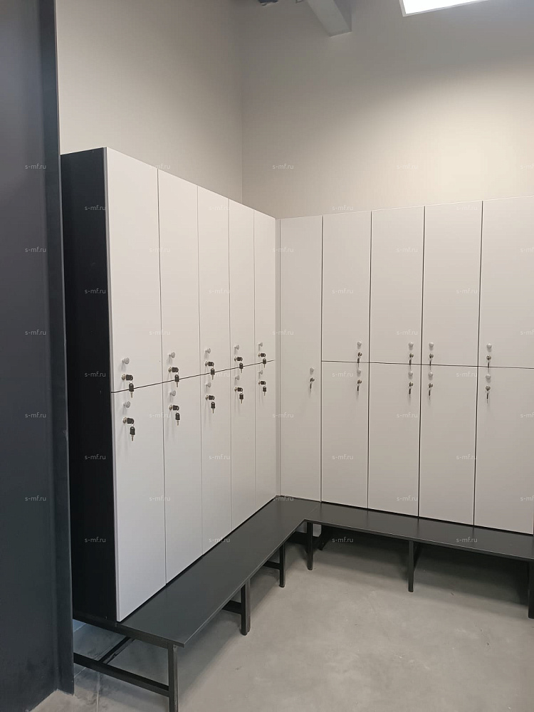 Двухсекционные шкафчики помогут сэкономить пространство в зоне раздевалки и обеспечить наибольшую вместимость мест на небольшой площади. Удобная опция - скамья с подставкой.