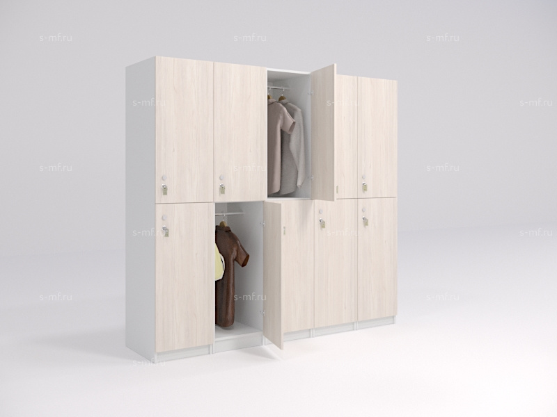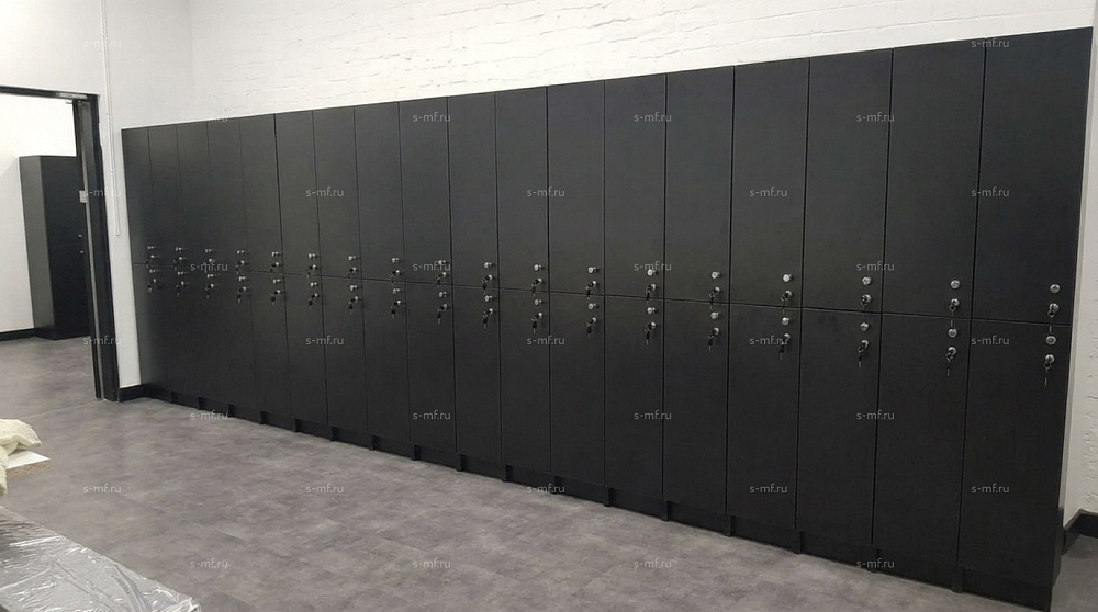 Двухсекционные шкафчики помогут сэкономить пространство в зоне раздевалки и обеспечить наибольшую вместимость мест на небольшой площади. Удобная опция - скамья с подставкой.