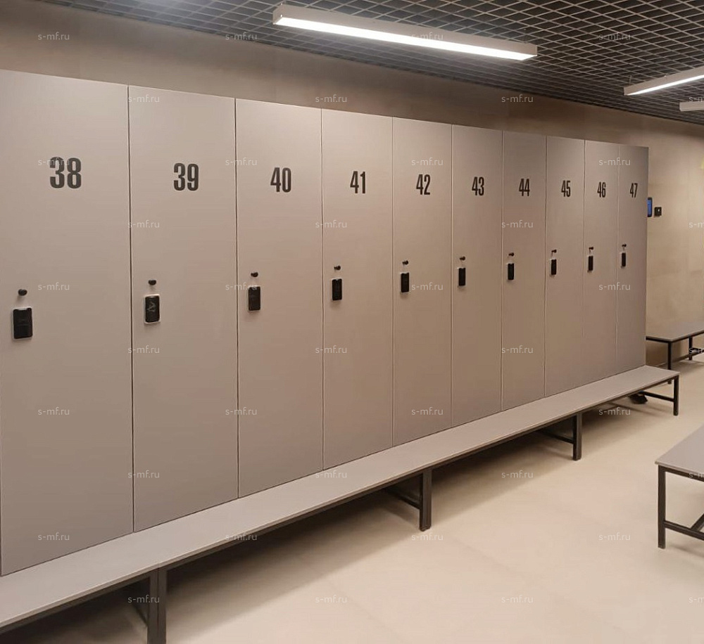 Односекционные шкафчики наиболее удобны для посетителей. Просторное внутреннее пространство создает максимальный комфорт при использовании. Такие модели чаще всего устанавливают в просторных раздевалках. Удобная опция - скамья с подставкой.