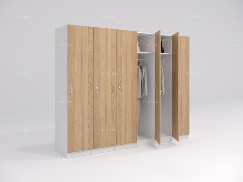 Односекционные шкафчики наиболее удобны для посетителей. Просторное внутреннее пространство создает максимальный комфорт при использовании. Такие модели чаще всего устанавливают в просторных раздевалках. Удобная опция - скамья с подставкой.