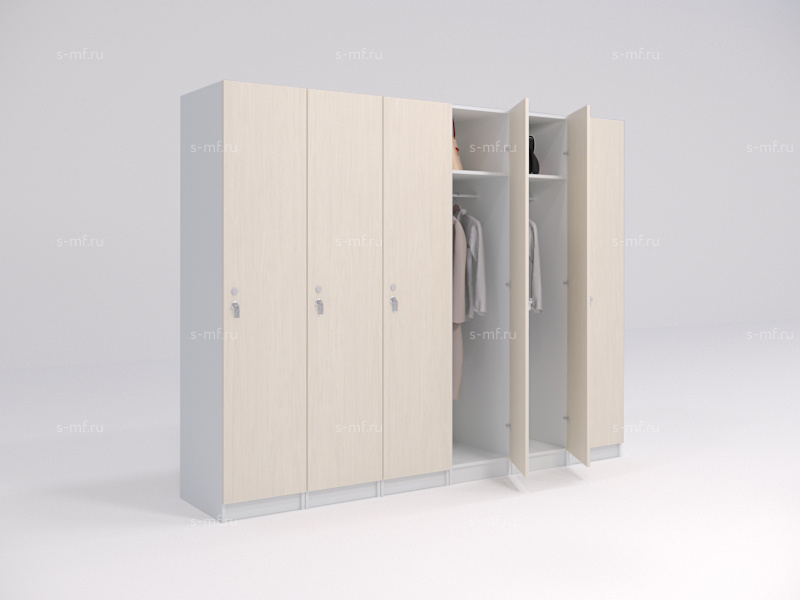 Односекционные шкафчики наиболее удобны для посетителей. Просторное внутреннее пространство создает максимальный комфорт при использовании. Такие модели чаще всего устанавливают в просторных раздевалках. Удобная опция - скамья с подставкой.