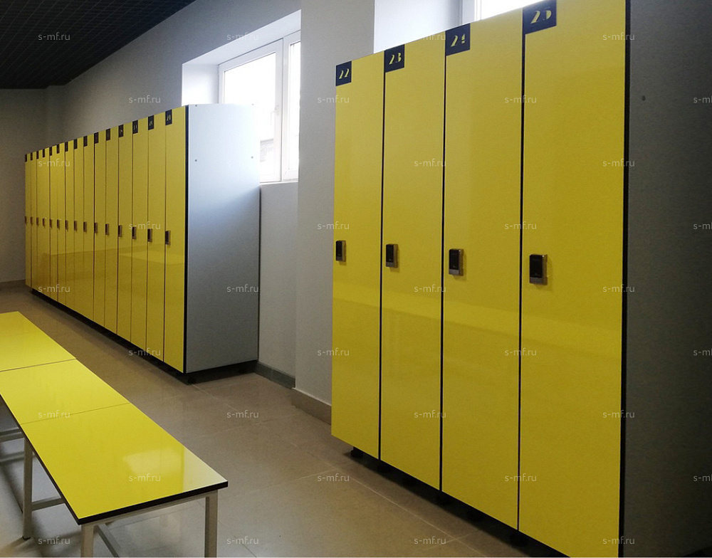 Односекционные шкафчики наиболее удобны для посетителей. Просторное внутреннее пространство создает максимальный комфорт при использовании. Такие модели чаще всего устанавливают в просторных раздевалках. Удобная опция - скамья с подставкой.