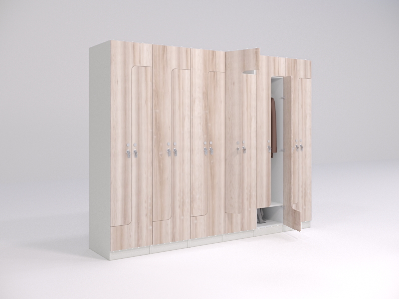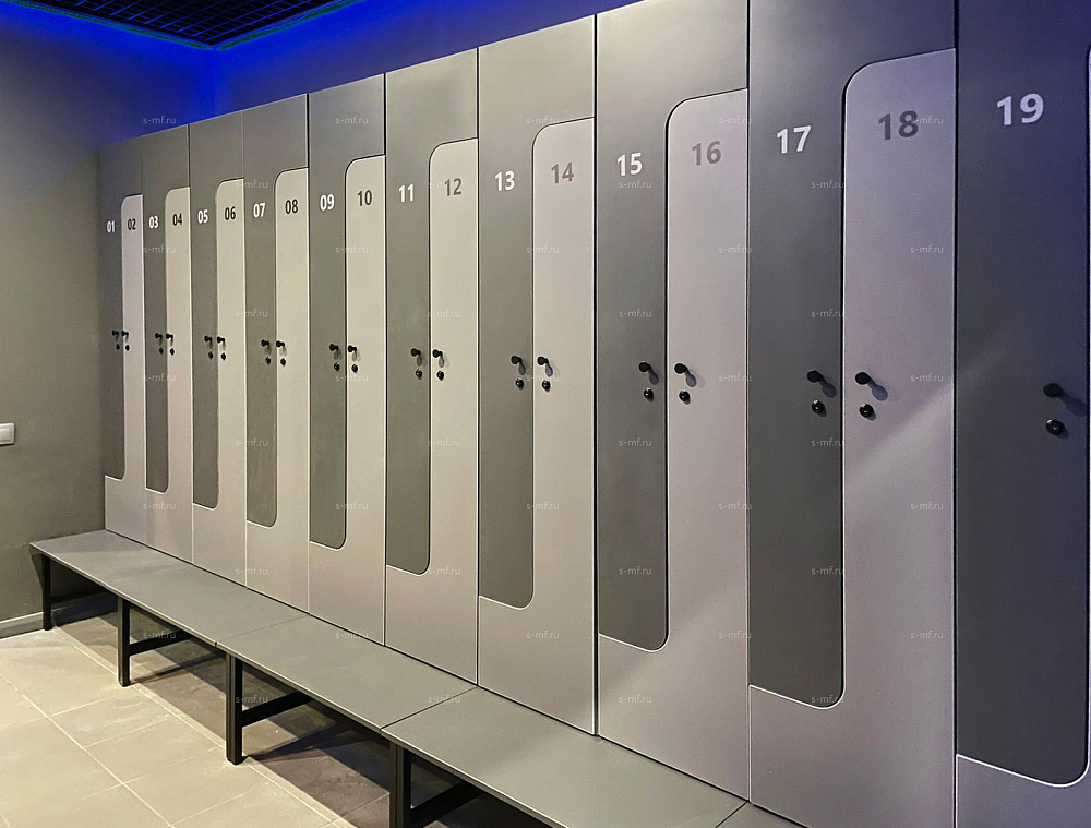 Z-образные шкафчики "Финн" сочетают в себе компактные размеры и удобную высоту 1-секционных моделей. Благодаря необычной форме фасадов и использованию различных цветовых решений, можно добиться интересного эффекта в гардеробной зоне. Удобная опция - скамья с подставкой.