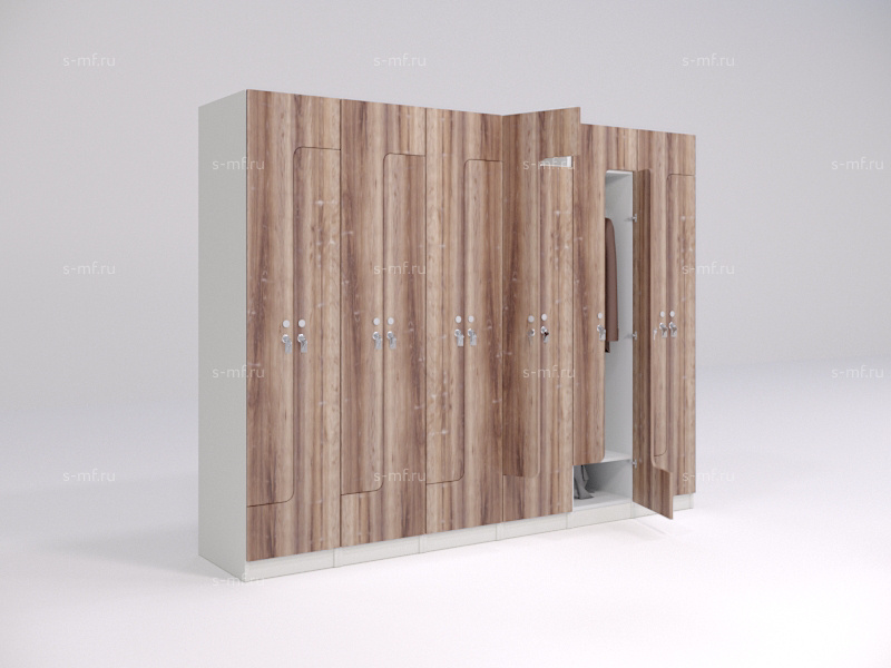 Z-образные шкафчики "Финн" сочетают в себе компактные размеры и удобную высоту 1-секционных моделей. Благодаря необычной форме фасадов и использованию различных цветовых решений, можно добиться интересного эффекта в гардеробной зоне. Удобная опция - скамья с подставкой.