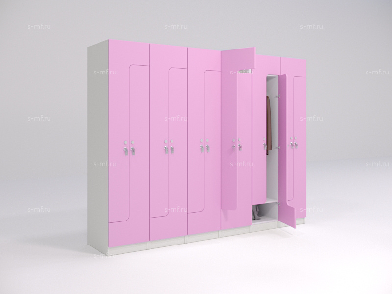 Z-образные шкафчики "Финн" сочетают в себе компактные размеры и удобную высоту 1-секционных моделей. Благодаря необычной форме фасадов и использованию различных цветовых решений, можно добиться интересного эффекта в гардеробной зоне. Удобная опция - скамья с подставкой.