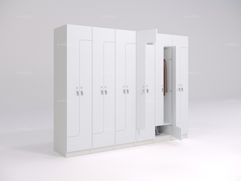 Z-образные шкафчики "Финн" сочетают в себе компактные размеры и удобную высоту 1-секционных моделей. Благодаря необычной форме фасадов и использованию различных цветовых решений, можно добиться интересного эффекта в гардеробной зоне. Удобная опция - скамья с подставкой.