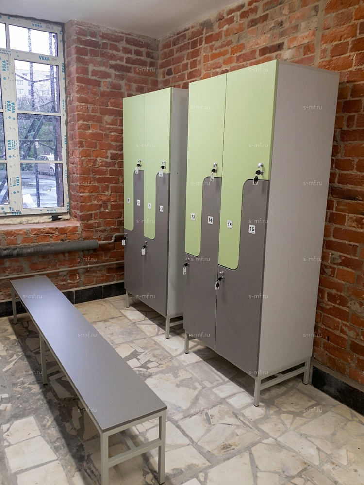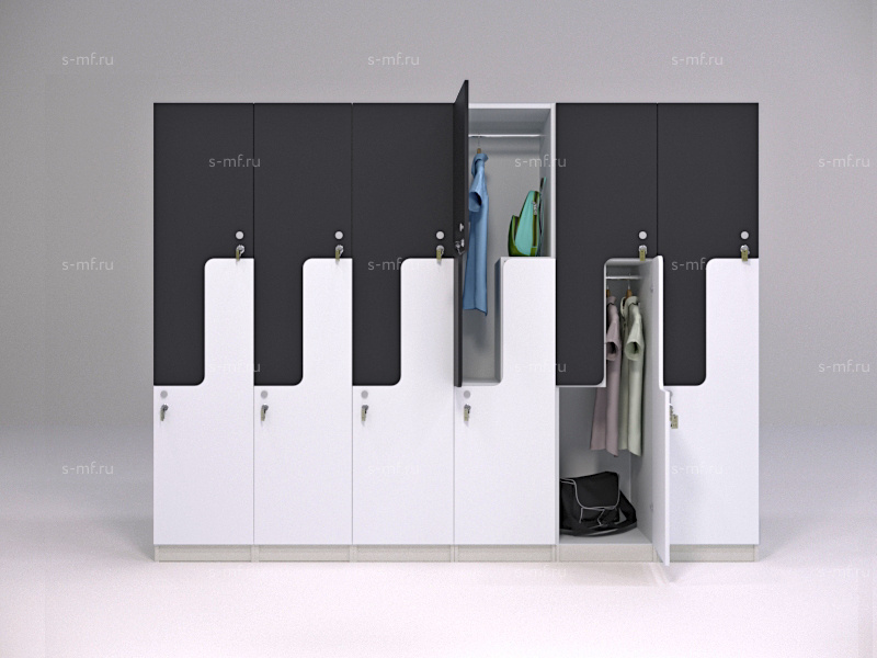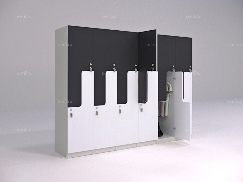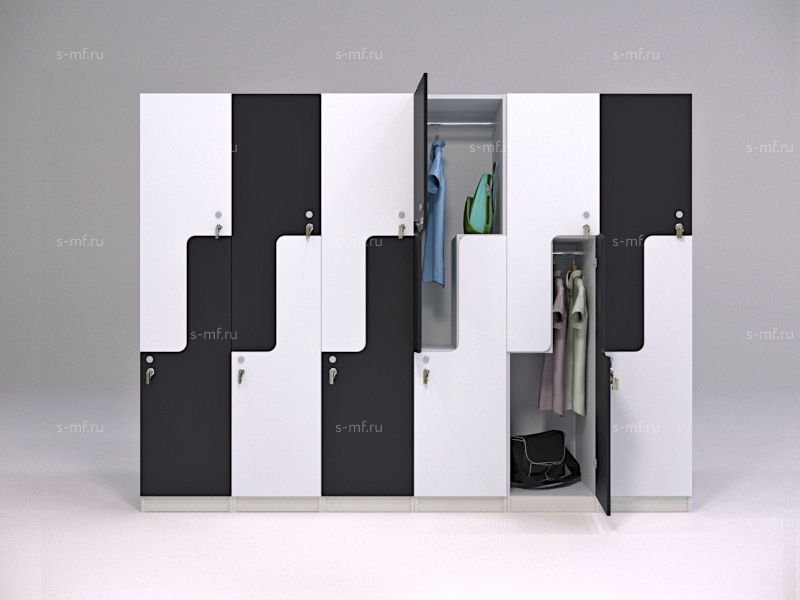 Z-образные шкафчики придадут оригинальности вашему интерьеру. В шкафчиках предусмотрены вместительные полки для сумок, головных уборов или обуви. На площади шириной 400мм вы получаете 2 вместительные секции, что позволяет грамотно использовать пространство. Удобная опция - скамья с подставкой.