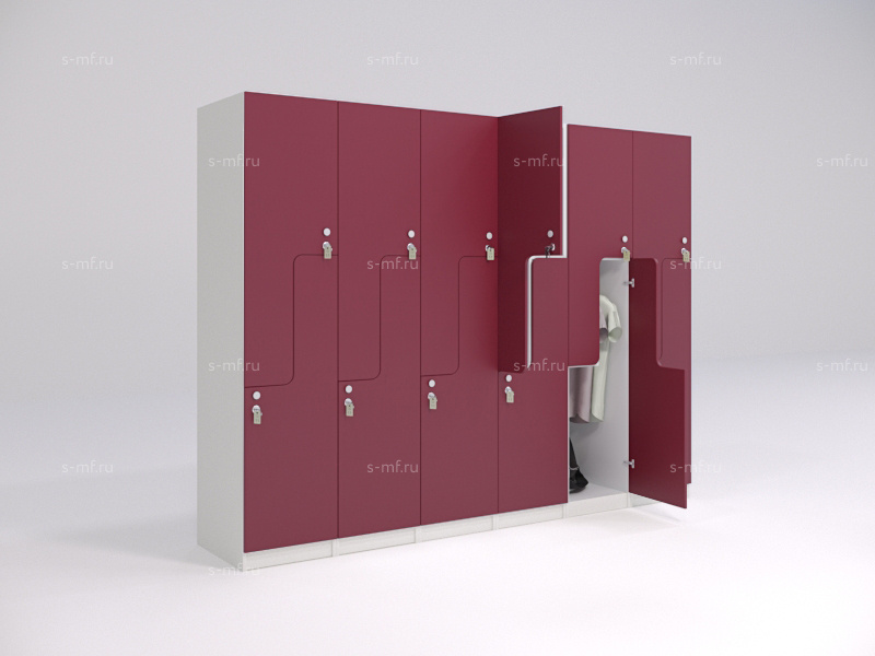 Z-образные шкафчики придадут оригинальности вашему интерьеру. В шкафчиках предусмотрены вместительные полки для сумок, головных уборов или обуви. На площади шириной 400мм вы получаете 2 вместительные секции, что позволяет грамотно использовать пространство. Удобная опция - скамья с подставкой.