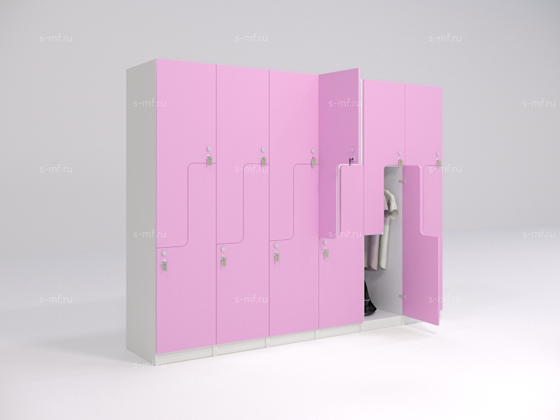 Z-образные шкафчики придадут оригинальности вашему интерьеру. В шкафчиках предусмотрены вместительные полки для сумок, головных уборов или обуви. На площади шириной 400мм вы получаете 2 вместительные секции, что позволяет грамотно использовать пространство. Удобная опция - скамья с подставкой.