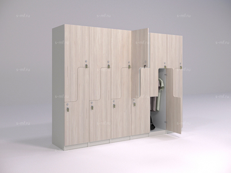 Z-образные шкафчики придадут оригинальности вашему интерьеру. В шкафчиках предусмотрены вместительные полки для сумок, головных уборов или обуви. На площади шириной 400мм вы получаете 2 вместительные секции, что позволяет грамотно использовать пространство. Удобная опция - скамья с подставкой.