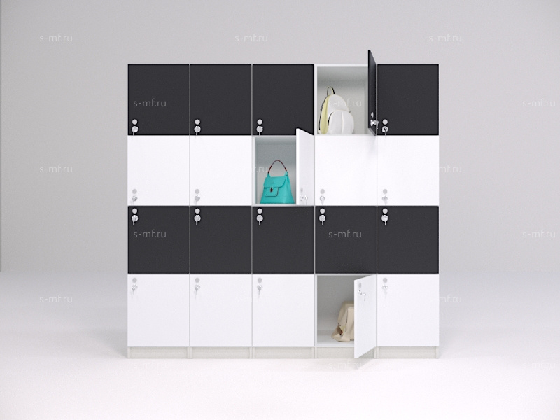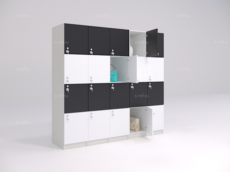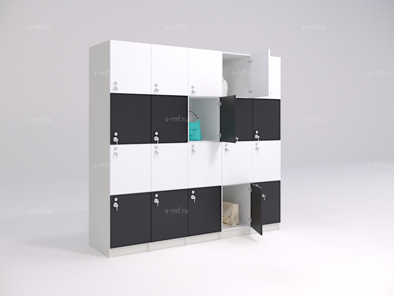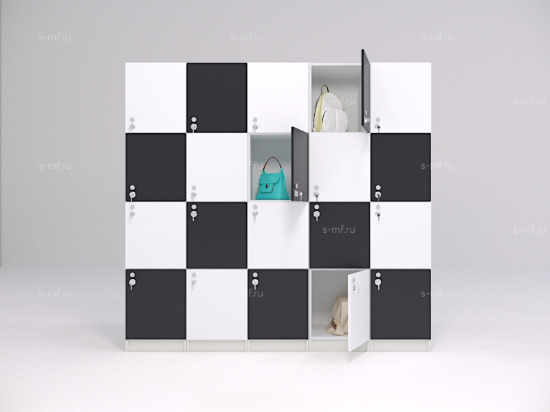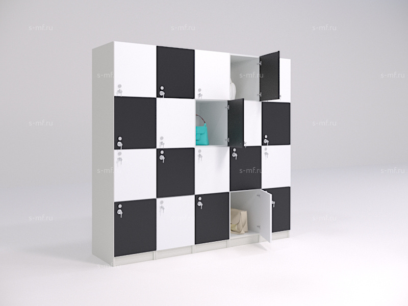 Шкафчики-сумочницы - это универсальная мебель для хранения обуви, головных уборов, спецодежды, сумок и других личных вещей. Шкафчики на 4 секции широко применяются в гипермаркетах, фитнес клубах, бизнес центрах, универсамах, раздевалках для персонала. Есть возможность фотопечати прямо на изделиях, нанесения логотипов, любых изображений, номеров.