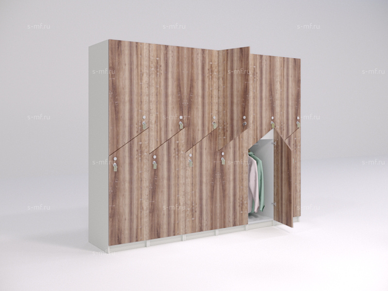 Двухсекционные шкафчики помогут сэкономить пространство в зоне раздевалки и обеспечить наибольшую вместимость мест на небольшой площади. Оригинальность формы фасадов сделает любое пространство еще более привлекательным. Удобная опция - скамья с подставкой.