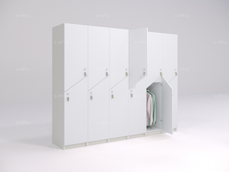 Двухсекционные шкафчики помогут сэкономить пространство в зоне раздевалки и обеспечить наибольшую вместимость мест на небольшой площади. Оригинальность формы фасадов сделает любое пространство еще более привлекательным. Удобная опция - скамья с подставкой.