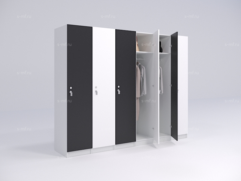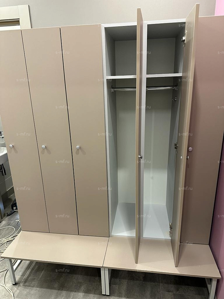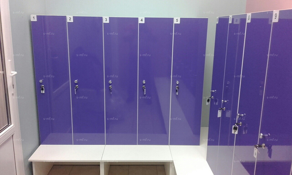 Односекционные шкафчики наиболее удобны для посетителей. Просторное внутреннее пространство создает максимальный комфорт при использовании. Такие модели чаще всего устанавливают в просторных раздевалках. Удобная опция - скамья с подставкой.