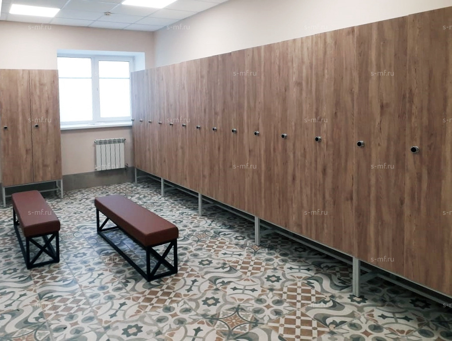Односекционные шкафчики наиболее удобны для посетителей. Просторное внутреннее пространство создает максимальный комфорт при использовании. Такие модели чаще всего устанавливают в просторных раздевалках. Удобная опция - скамья с подставкой.