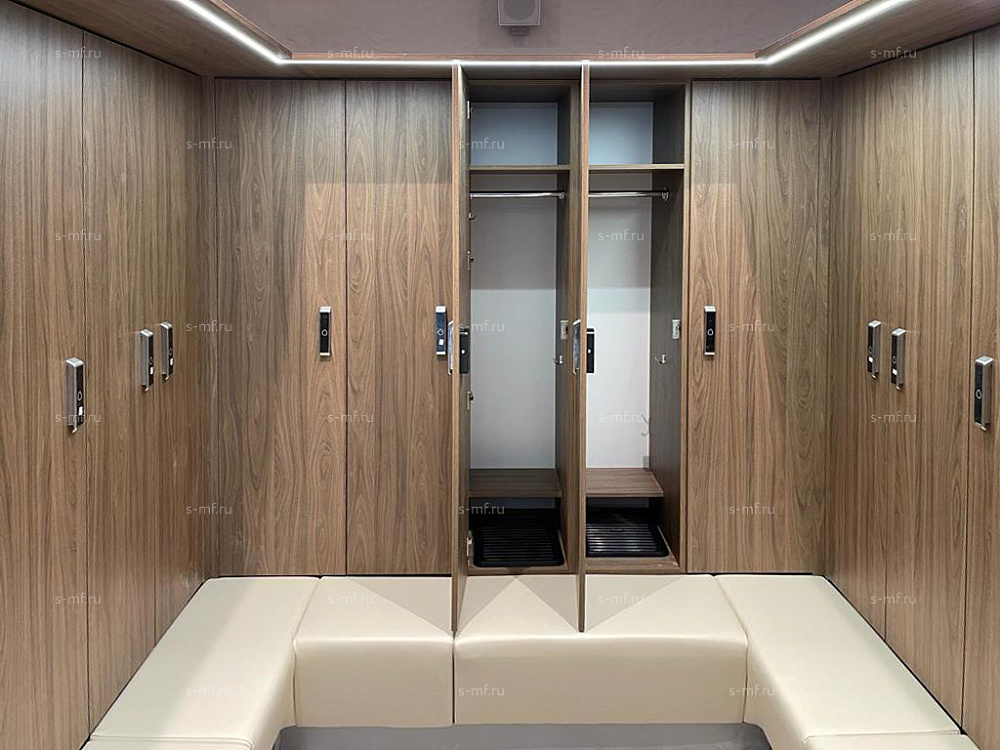 Односекционные шкафчики наиболее удобны для посетителей. Просторное внутреннее пространство создает максимальный комфорт при использовании. Такие модели чаще всего устанавливают в просторных раздевалках. Удобная опция - скамья с подставкой.