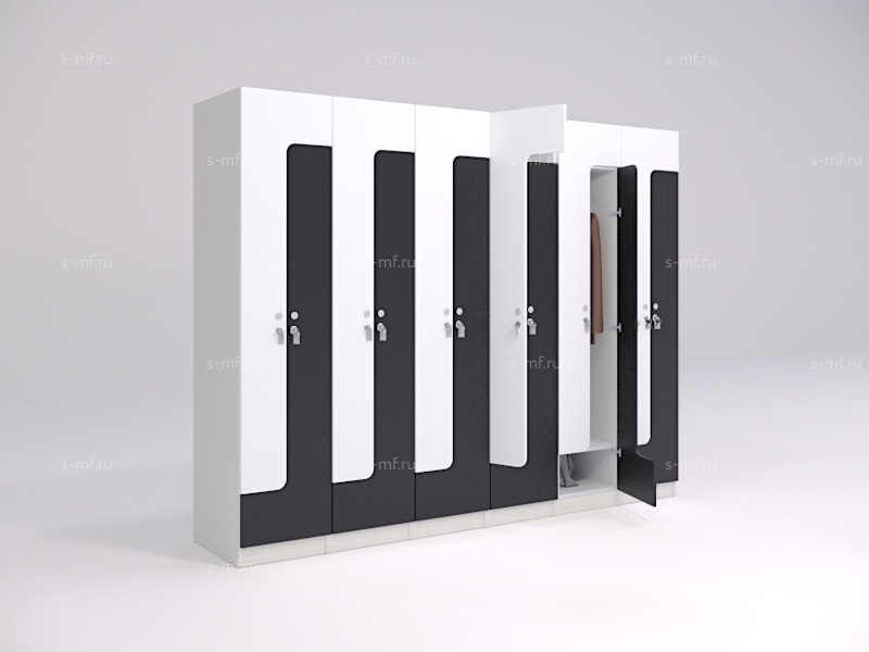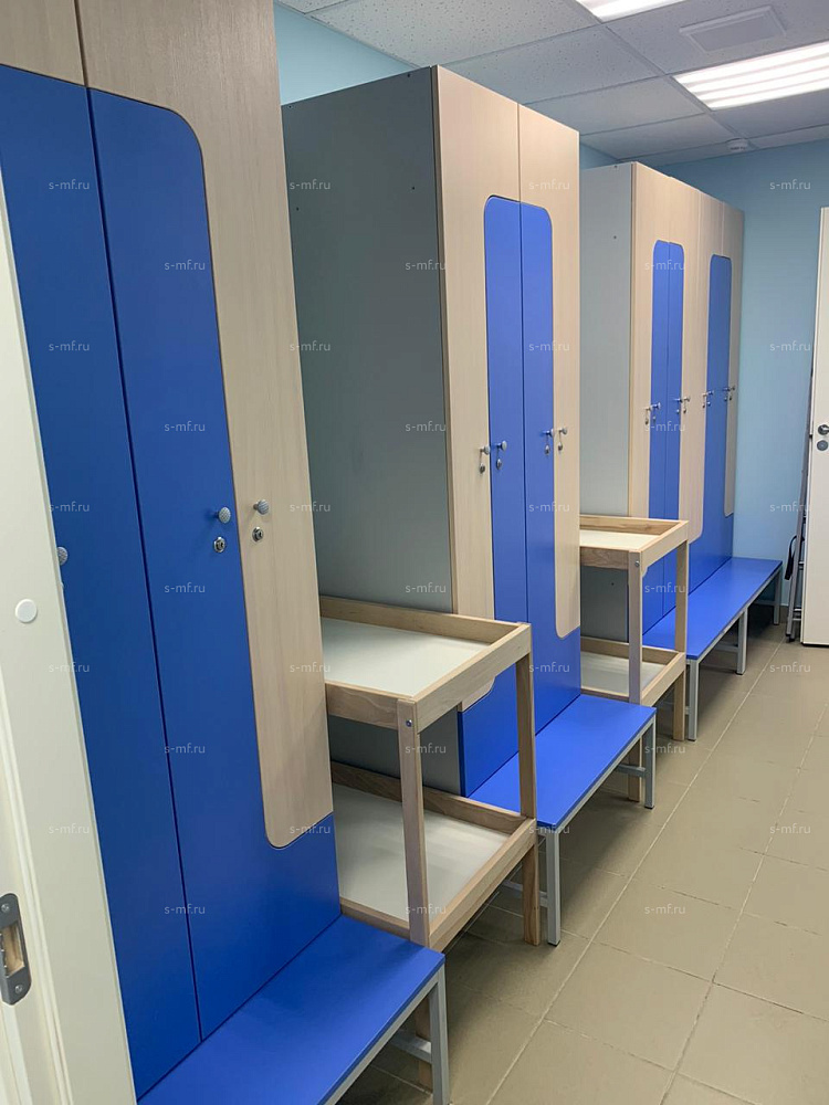 Z-образные шкафчики "Финн" сочетают в себе компактные размеры и удобную высоту 1-секционных моделей. Благодаря необычной форме фасадов и использованию различных цветовых решений, можно добиться интересного эффекта в гардеробной зоне. Удобная опция - скамья с подставкой.