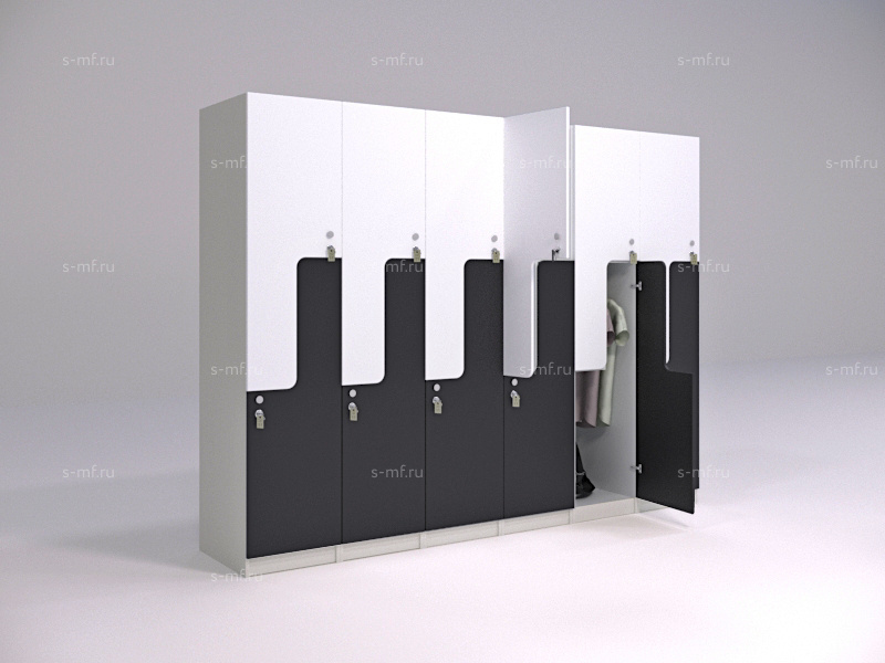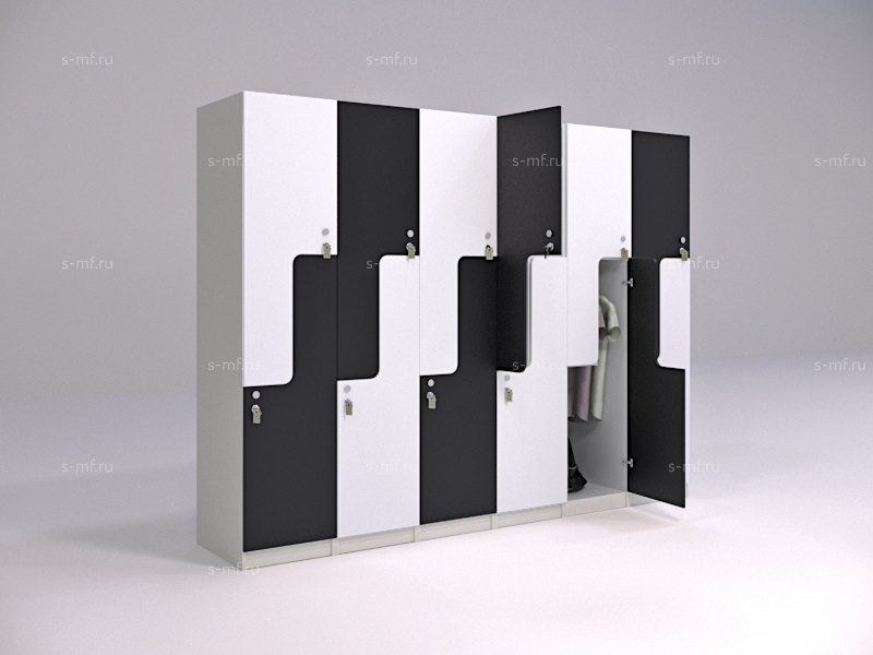 Z-образные шкафчики придадут оригинальности вашему интерьеру. В шкафчиках предусмотрены вместительные полки для сумок, головных уборов или обуви. На площади шириной 400мм вы получаете 2 вместительные секции, что позволяет грамотно использовать пространство. Удобная опция - скамья с подставкой.
