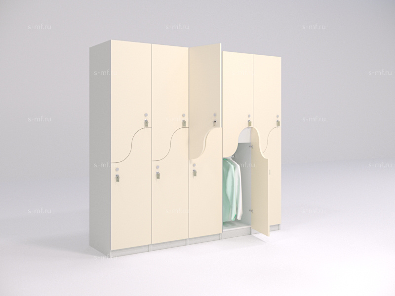 S-образные шкафчики - это удобный вариант 2-секционных моделей, они помогут сэкономить пространство в зоне раздевалки и обеспечить наибольшую вместимость мест на небольшой площади. Шкафчики имеют полки для хранения личных вещей, сумок, головных уборов, а также штанги для вешалок. Оригинальность формы фасадов сделает любое пространство еще более привлекательным.