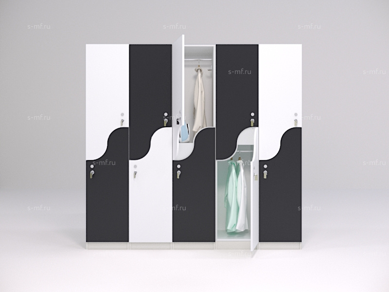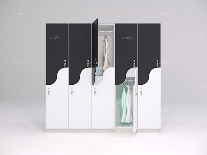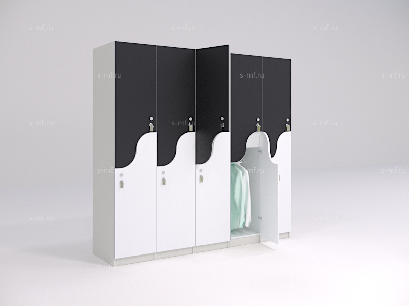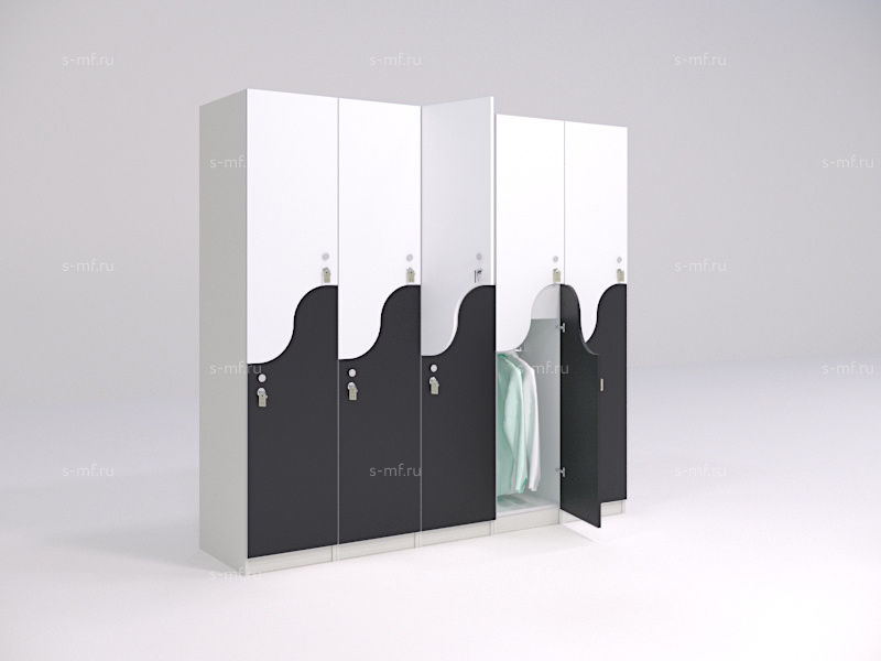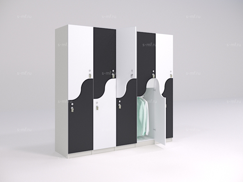 S-образные шкафчики - это удобный вариант 2-секционных моделей, они помогут сэкономить пространство в зоне раздевалки и обеспечить наибольшую вместимость мест на небольшой площади. Шкафчики имеют полки для хранения личных вещей, сумок, головных уборов, а также штанги для вешалок. Оригинальность формы фасадов сделает любое пространство еще более привлекательным.