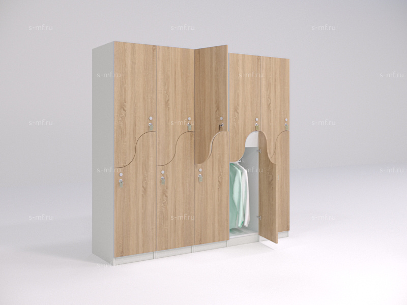 S-образные шкафчики - это удобный вариант 2-секционных моделей, они помогут сэкономить пространство в зоне раздевалки и обеспечить наибольшую вместимость мест на небольшой площади. Шкафчики имеют полки для хранения личных вещей, сумок, головных уборов, а также штанги для вешалок. Оригинальность формы фасадов сделает любое пространство еще более привлекательным.