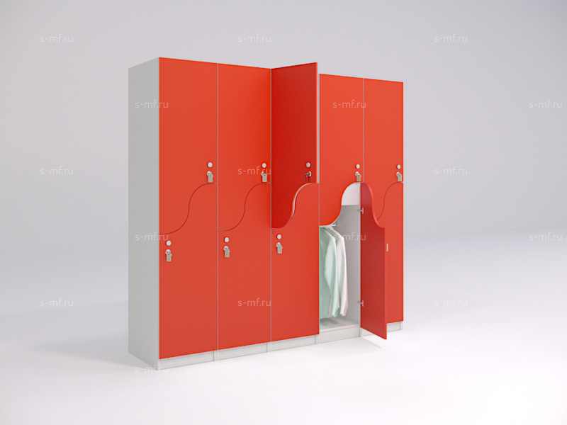 S-образные шкафчики - это удобный вариант 2-секционных моделей, они помогут сэкономить пространство в зоне раздевалки и обеспечить наибольшую вместимость мест на небольшой площади. Шкафчики имеют полки для хранения личных вещей, сумок, головных уборов, а также штанги для вешалок. Оригинальность формы фасадов сделает любое пространство еще более привлекательным.